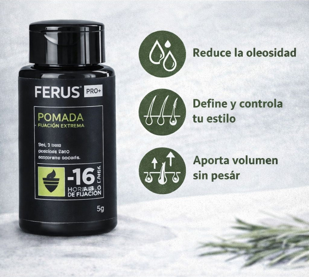 Logra un peinado firme, definido y con volumen durante todo el día. FERUS Pomada ofrece hasta 16 horas de fijación, controla el frizz y reduce la oleosidad, dejando un acabado limpio y natural sin sensación grasosa.